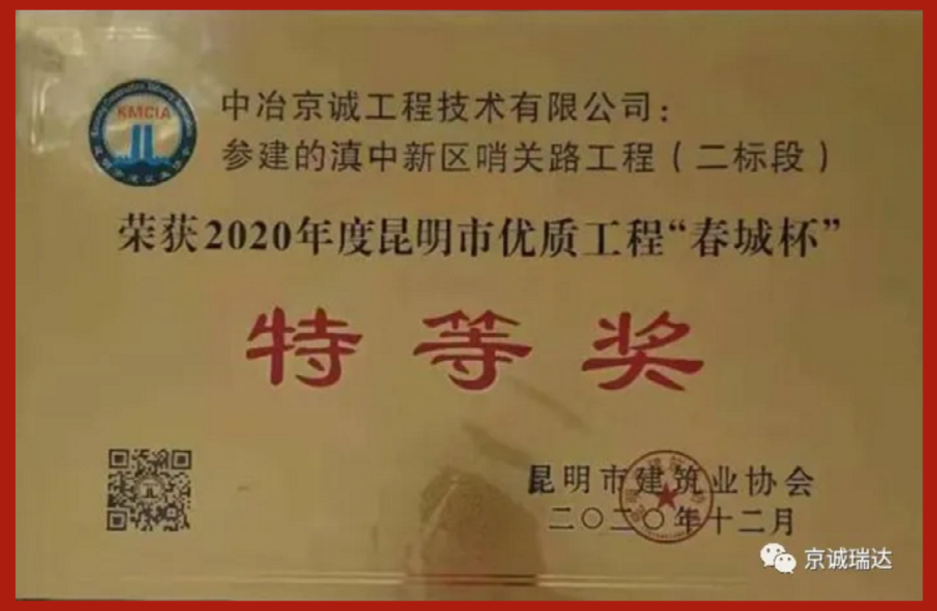 - 日前,由中城佳旭与中冶京诚合作建设的“滇中新区哨关路工程(二标段)”荣获“2020年度昆明市优质工程...
